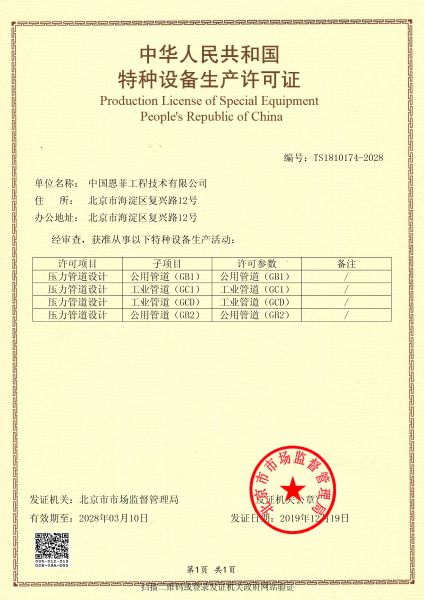 中华国民共和国特种装备出产允许证(压力管道)